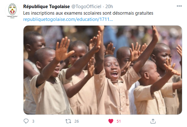 Au Togo, les frais d’inscription aux différents examens scolaires (CEPD, BEPC, Probatoire, BAC, BTS, etc…) sont désormais supprimés.Source officielle : https://www.republiquetogolaise.com/education/1711-4853-les-inscriptions-aux-examens-scolaires-sont-desormais-gratuites